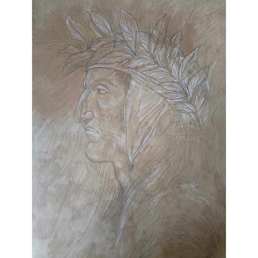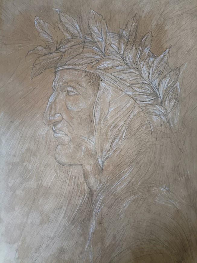 "Un profilo severo e pensieroso emerge dalla carta bruna. Le matite, una bianca e una nera, creano un gioco di luci e ombre che scolpisce i lineamenti di Dante: il naso aquilino, il mento forte, le labbra serrate. L'ombra profonda della matita nera delinea i contorni, mentre i tocchi di bianco illuminano la fronte, l'occhio e il collo, dando volume e vita al volto. Una corona d'alloro, disegnata con la stessa tecnica, si appoggia sul capo del poeta, simbolo della sua gloria letteraria. L'intera opera ha un'atmosfera quasi antica, come se il ritratto fosse un frammento di storia riemerso dal tempo."