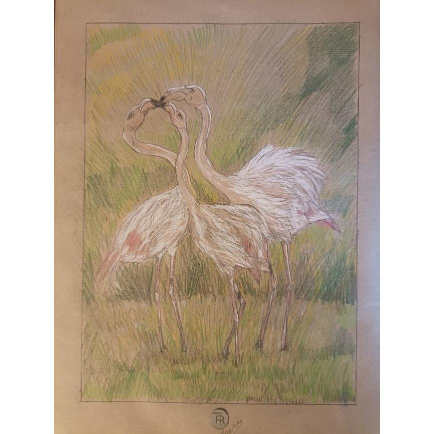 Il disegno raffigura tre fenicotteri che giocano nel mezzo di un grande prato .