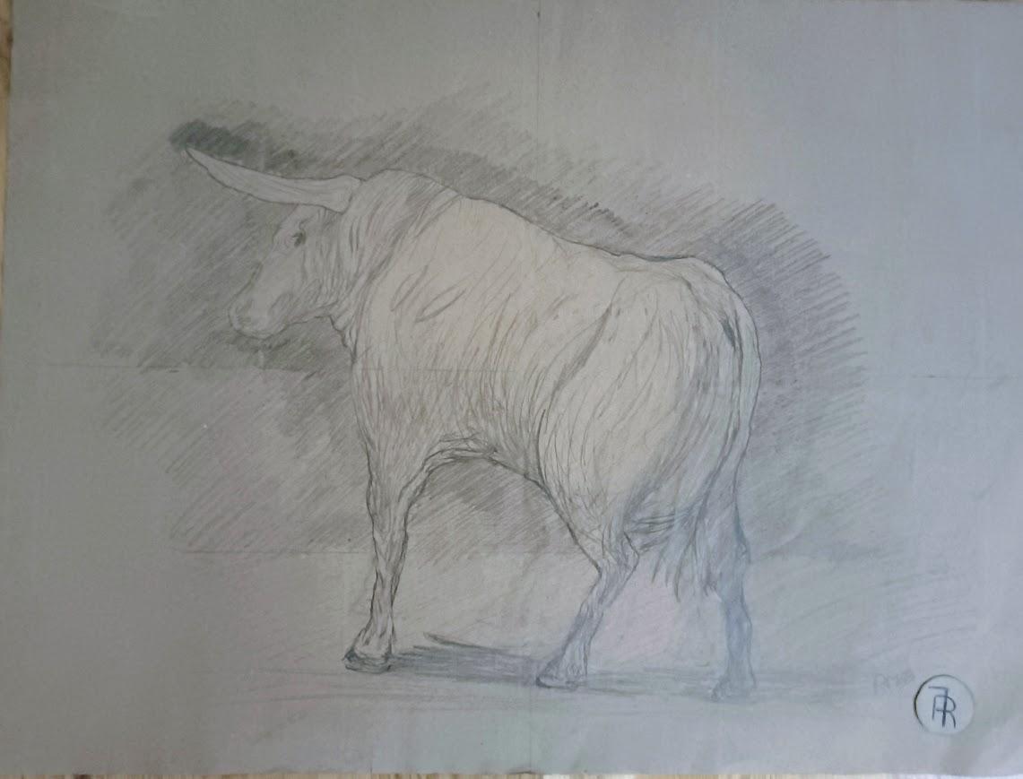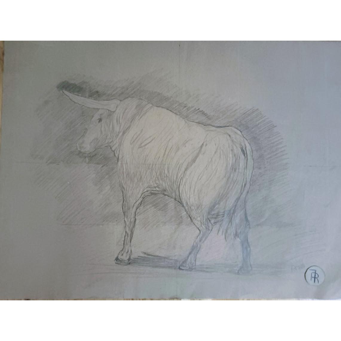 Un toro possente e dinamico, che ne esaltano la muscolatura e la forza grezza sul grande foglio.