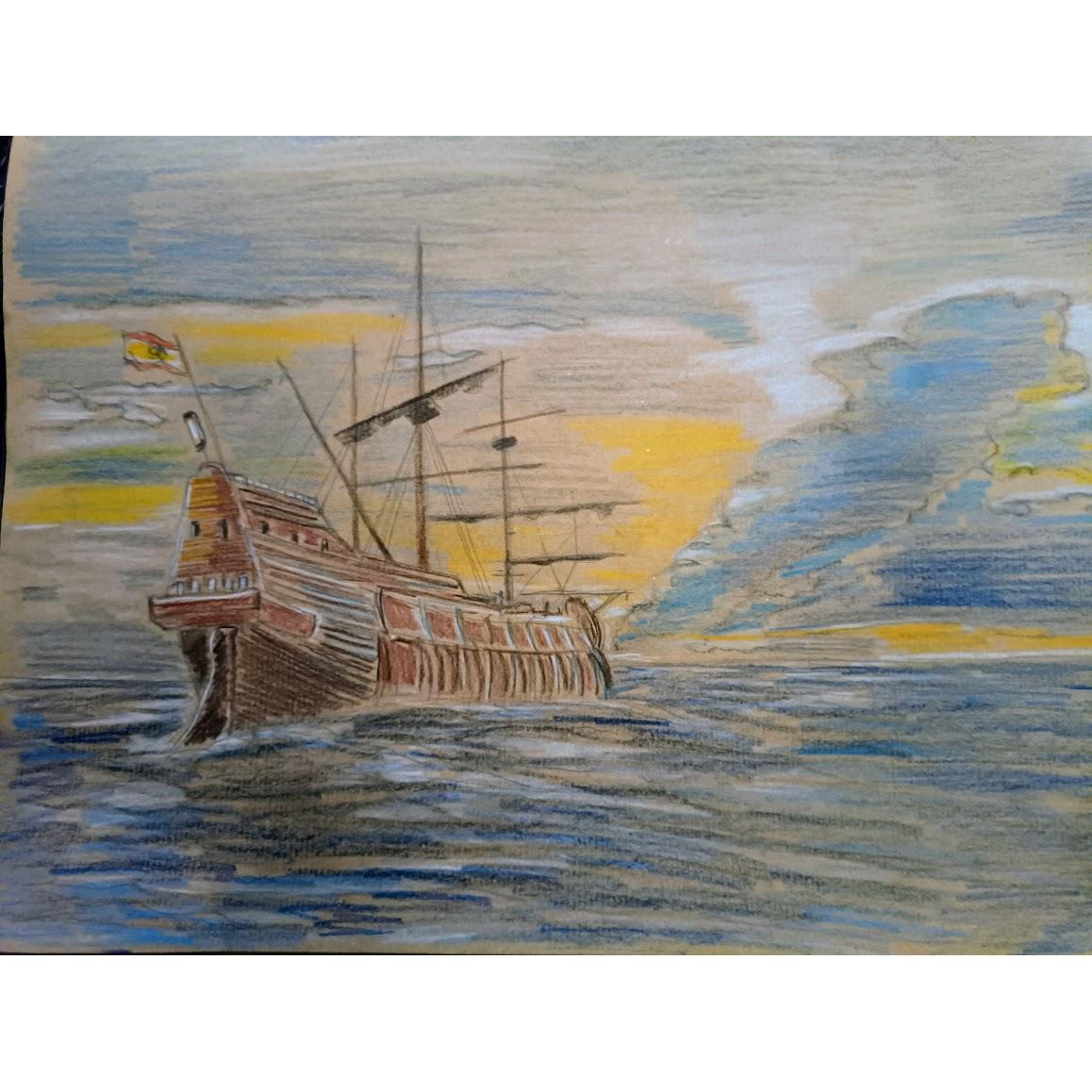 'Un maestoso galeone d'epoca che solca un mare calmo,immerso in un cielo dalle sfumature dorate che evoca un senso di avventura e mistero.